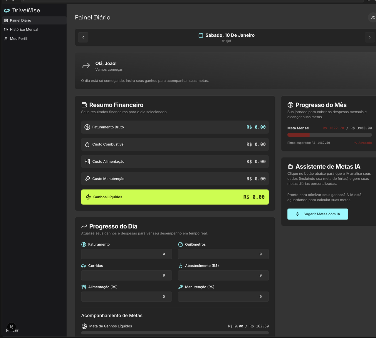 "Eu achava que faturamento era lucro. O DriverWise me deu um choque de realidade ao mostrar meu ganho líquido. Depois que vi para onde meu dinheiro realmente ia, meu resultado melhorou 20% no primeiro mês."